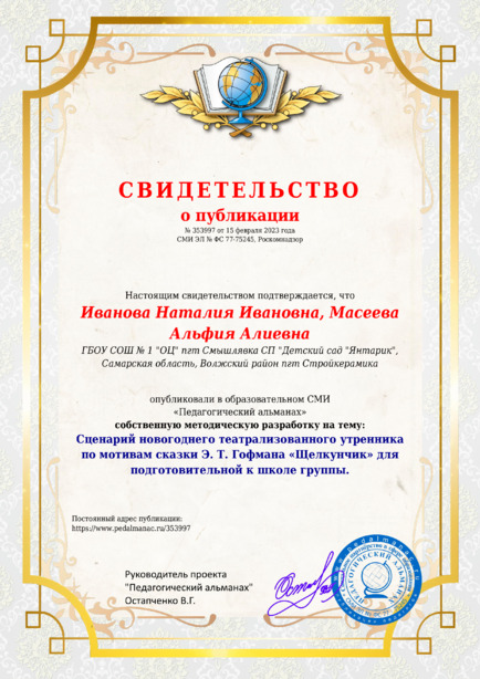 Иванова Наталия Ивановна, Масеева Альфия Алиевна Сценарий новогоднего театрализованного утренника по мотивам сказки Э. Т. Гофмана «Щелкунчик» для подготовительной к школе группы. / Н. И. Иванова. – Текст : электронный // Педагогический альманах : электронное СМИ. - URL: https://www.pedalmanac.ru/353997. - Дата публикации: 15 февраля 2023.