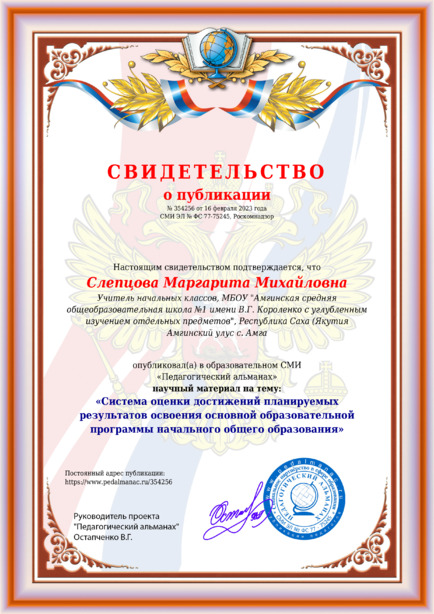 Слепцова Маргарита Михайловна “Система оценки достижений планируемых результатов освоения основной образовательной программы начального общего образования” / М. М. Слепцова. – Текст : электронный // Педагогический альманах : электронное СМИ. - URL: https://www.pedalmanac.ru/354256. - Дата публикации: 16 февраля 2023.