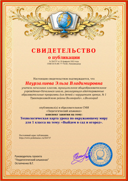 Наурзалиева Эльза Владимировна Технологическая карта урока по окружающему миру для 1 класса на тему: «Выйдем в сад и огород». / Э. В. Наурзалиева. – Текст : электронный // Педагогический альманах : электронное СМИ. - URL: https://www.pedalmanac.ru/354737. - Дата публикации: 19 февраля 2023.