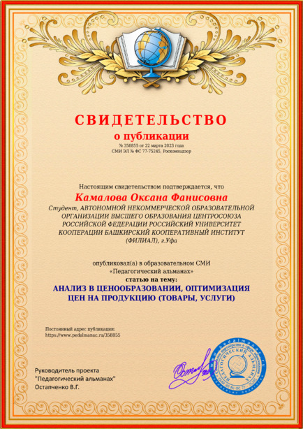 Камалова, О. Ф. АНАЛИЗ В ЦЕНООБРАЗОВАНИИ, ОПТИМИЗАЦИЯ ЦЕН НА ПРОДУКЦИЮ (ТОВАРЫ, УСЛУГИ) [Электронный ресурс] / Оксана Фанисовна Камалова // Педагогический альманах : [сайт]. - 2023. - 22 марта. - [Россия]. - Режим доступа: https://www.pedalmanac.ru/358855, свободный. - Загл. с экрана.