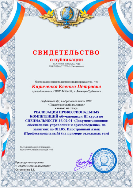 Кириченко Ксения Петровна РЕАЛИЗАЦИЯ ПРОФЕССИОНАЛЬНЫХ КОМПЕТЕНЦИЙ обучающихся III курса по СПЕЦИАЛЬНОСТИ 46.02.01 «Документационное обеспечение управления и архивоведение» на занятиях по ОП.05. Иностранный язык (Профессиональный) (на примере отдельных тем) / К. П. Кириченко. – Текст : электронный // Педагогический альманах : электронное СМИ. - URL: https://www.pedalmanac.ru/367883. - Дата публикации: 31 мая 2023.