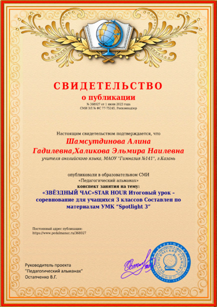 Шамсутдинова Алина Гадилевна,Халикова Эльмира Наилевна «ЗВЁЗДНЫЙ ЧАС»STAR HOUR Итоговый урок – соревнование для учащихся 3 классов Составлен по материалам УМК “Spotlight 3” / А. Г. Шамсутдинова. – Текст : электронный // Педагогический альманах : электронное СМИ. - URL: https://www.pedalmanac.ru/368027. - Дата публикации: 1 июня 2023.