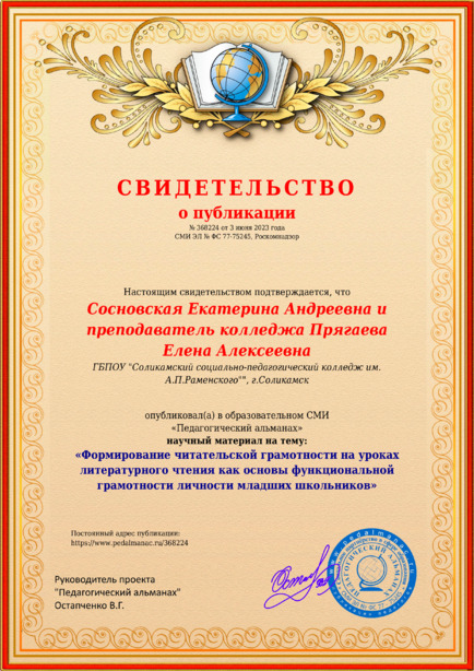 Сосновская Екатерина Андреевна и преподаватель колледжа Прягаева Елена Алексеевна “Формирование читательской грамотности на уроках литературного чтения как основы функциональной грамотности личности младших школьников” / Е. А. Сосновская. – Текст : электронный // Педагогический альманах : электронное СМИ. - URL: https://www.pedalmanac.ru/368224. - Дата публикации: 3 июня 2023.