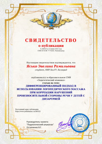 Ясько, Э. Р. ДИФФЕРЕНЦИРОВАННЫЙ ПОДХОД В ИСПОЛЬЗОВАНИИ ЛОГОПЕДИЧЕСКОГО МАССАЖА ПРИ КОРРЕКЦИИ НАРУШЕНИЙ ПРОИЗНОСИТЕЛЬНОЙ СТОРОНЫ РЕЧИ У ДЕТЕЙ С ДИЗАРТРИЕЙ [Электронный ресурс] / Эвелина Рамильевна Ясько // Педагогический альманах : [сайт]. - 2023. - 12 июня. - [Россия]. - Режим доступа: https://www.pedalmanac.ru/369325, свободный. - Загл. с экрана.