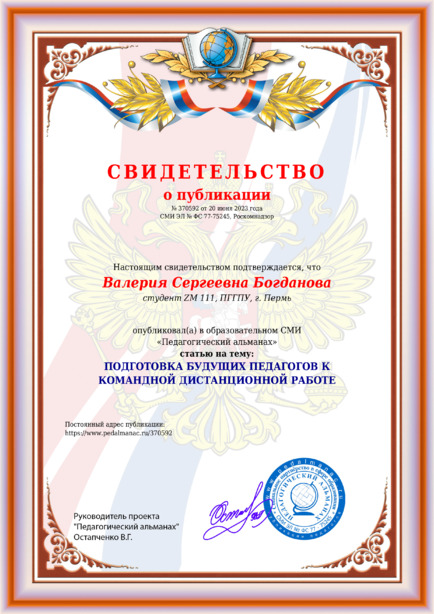 Валерия Сергеевна Богданова ПОДГОТОВКА БУДУЩИХ ПЕДАГОГОВ К КОМАНДНОЙ ДИСТАНЦИОННОЙ РАБОТЕ / С. Б. Валерия. – Текст : электронный // Педагогический альманах : электронное СМИ. - URL: https://www.pedalmanac.ru/370592. - Дата публикации: 20 июня 2023.