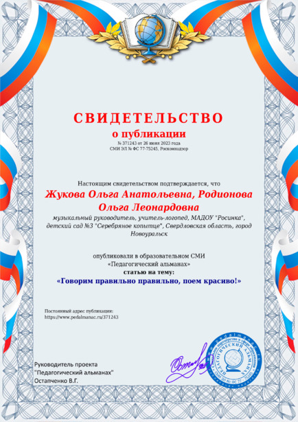Жукова Ольга Анатольевна, Родионова Ольга Леонардовна “Говорим правильно правильно, поем красиво!” / О. А. Жукова. – Текст : электронный // Педагогический альманах : электронное СМИ. - URL: https://www.pedalmanac.ru/371243. - Дата публикации: 26 июня 2023.