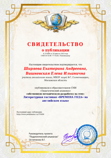 Ширяева Екатерина Андреевна, Вишневская Елена Ильинична Литературная гостиная “ВРЕМЕНА ГОДА” на английском языке / Е. А. Ширяева. – Текст : электронный // Педагогический альманах : электронное СМИ. - URL: https://www.pedalmanac.ru/374484. - Дата публикации: 19 августа 2023.