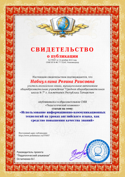 Набиуллина Регина Раисовна «Использование информационно-коммуникационных технологий на уроках английского языка, как средство повышения качества знаний» / Р. Р. Набиуллина. – Текст : электронный // Педагогический альманах : электронное СМИ. - URL: https://www.pedalmanac.ru/379957. - Дата публикации: 16 октября 2023.