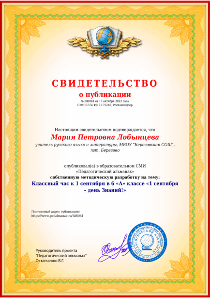 Мария Петровна Лобынцева Классный час к 1 сентября в 6 «А» классе «1 сентября – день Знаний!» / П. Л. Мария. – Текст : электронный // Педагогический альманах : электронное СМИ. - URL: https://www.pedalmanac.ru/380061. - Дата публикации: 17 октября 2023.