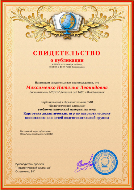 Максименко Наталья Леонидовна Картотека дидактических игр по патриотическому воспитанию для детей подготовительной группы / Н. Л. Максименко. – Текст : электронный // Педагогический альманах : электронное СМИ. - URL: https://www.pedalmanac.ru/380429. - Дата публикации: 19 октября 2023.