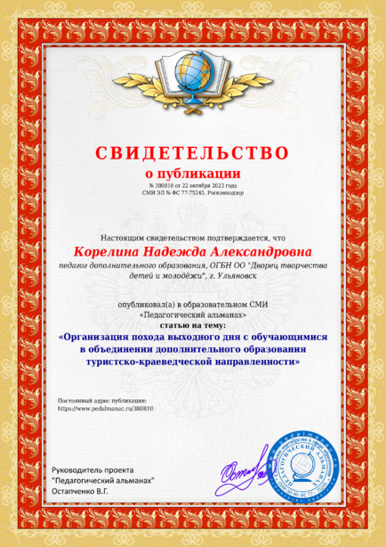 Корелина Надежда Александровна «Организация похода выходного дня с обучающимися в объединении дополнительного образования туристско-краеведческой направленности» / Н. А. Корелина. – Текст : электронный // Педагогический альманах : электронное СМИ. - URL: https://www.pedalmanac.ru/380810. - Дата публикации: 22 октября 2023.