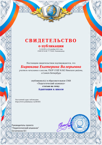 Бирюкова Екатерина Валерьевна Адаптация к школе / Е. В. Бирюкова. – Текст : электронный // Педагогический альманах : электронное СМИ. - URL: https://www.pedalmanac.ru/381855. - Дата публикации: 30 октября 2023.
