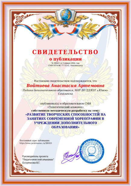 Войтиева Анастасия Артемовна «РАЗВИТИЕ ТВОРЧЕСКИХ СПОСОБНОСТЕЙ НА ЗАНЯТИЯХ СОВРЕМЕННОЙ ХОРЕОГРАФИИ В УЧРЕЖДЕНИИ ДОПОЛНИТЕЛЬНОГО ОБРАЗОВАНИЯ» / А. А. Войтиева. – Текст : электронный // Педагогический альманах : электронное СМИ. - URL: https://www.pedalmanac.ru/390431. - Дата публикации: 5 января 2024.