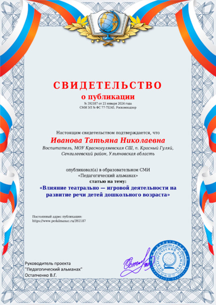 Иванова Татьяна Николаевна “Влияние театрально – игровой деятельности на развитие речи детей дошкольного возраста” / Т. Н. Иванова. – Текст : электронный // Педагогический альманах : электронное СМИ. - URL: https://www.pedalmanac.ru/392187. - Дата публикации: 23 января 2024.