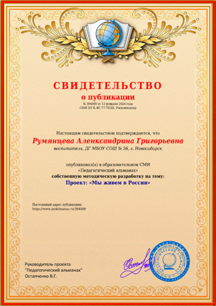 Румянцева Аленксандрина Григорьевна Проект: “Мы живем в России” / А. Г. Румянцева. – Текст : электронный // Педагогический альманах : электронное СМИ. - URL: https://www.pedalmanac.ru/394089. - Дата публикации: 13 февраля 2024.