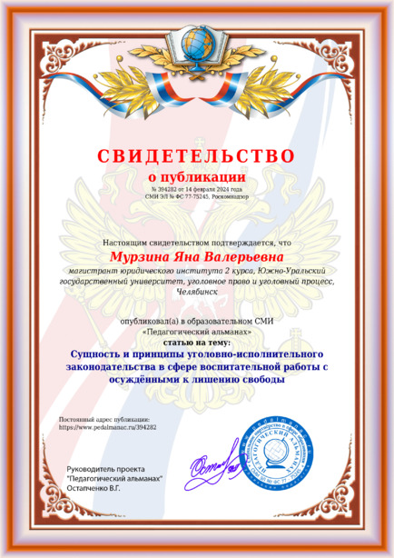 Мурзина Яна Валерьевна Сущность и принципы уголовно-исполнительного законодательства в сфере воспитательной работы с осуждёнными к лишению свободы / Я. В. Мурзина. – Текст : электронный // Педагогический альманах : электронное СМИ. - URL: https://www.pedalmanac.ru/394282. - Дата публикации: 14 февраля 2024.