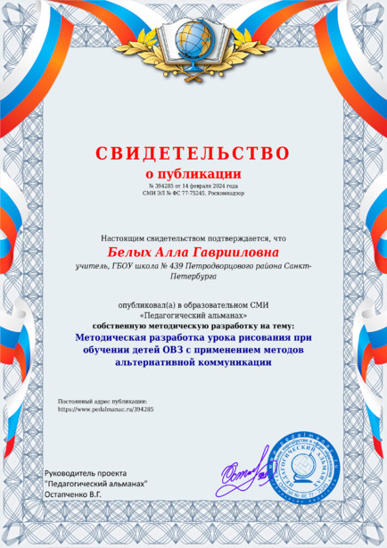 Белых Алла Гаврииловна Методическая разработка урока рисования при обучении детей ОВЗ с применением методов альтернативной коммуникации / А. Г. Белых. – Текст : электронный // Педагогический альманах : электронное СМИ. - URL: https://www.pedalmanac.ru/394285. - Дата публикации: 14 февраля 2024.