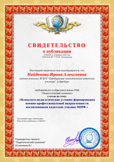 Найденова Ирина Алексеевна “Психолого-педагогические условия формирования военно-профессиональной направленности воспитанников кадетских училищ МОРФ “ / И. А. Найденова. – Текст : электронный // Педагогический альманах : электронное СМИ. - URL: https://www.pedalmanac.ru/394525. - Дата публикации: 18 февраля 2024.