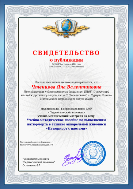 Чтенцова, Я. В. Учебно-методическое пособие по выполнению натюрморта в технике акварельной живописи «Натюрморт с цветами» [Электронный ресурс] / Яна Валентиновна Чтенцова // Педагогический альманах : [сайт]. - 2024. - 1 апреля. - [Россия]. - Режим доступа: https://www.pedalmanac.ru/398379, свободный. - Загл. с экрана.