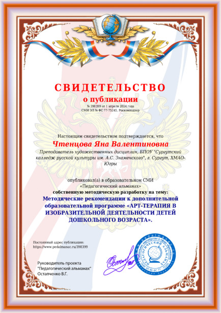 Чтенцова Яна Валентиновна Методические рекомендации к дополнительной образовательной программе «АРТ-ТЕРАПИЯ В ИЗОБРАЗИТЕЛЬНОЙ ДЕЯТЕЛЬНОСТИ ДЕТЕЙ ДОШКОЛЬНОГО ВОЗРАСТА». / Я. В. Чтенцова. – Текст : электронный // Педагогический альманах : электронное СМИ. - URL: https://www.pedalmanac.ru/398399. - Дата публикации: 1 апреля 2024.