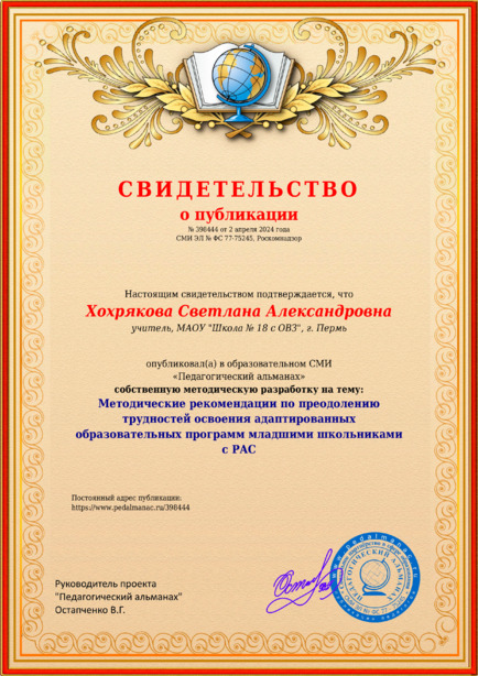 Хохрякова Светлана Александровна Методические рекомендации по преодолению трудностей освоения адаптированных образовательных программ младшими школьниками с РАС / С. А. Хохрякова. – Текст : электронный // Педагогический альманах : электронное СМИ. - URL: https://www.pedalmanac.ru/398444. - Дата публикации: 2 апреля 2024.