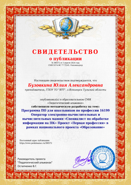 Бузовкина Юлия Александровна Программа ПО для школьников по профессии 16199 Оператор электронно-вычислительных и вычислительных машин «Специалист по обработке информации на ПК» Проект «Первая профессия» в рамках национального проекта “Образование” / Ю. А. Бузовкина. – Текст : электронный // Педагогический альманах : электронное СМИ. - URL: https://www.pedalmanac.ru/398572. - Дата публикации: 3 апреля 2024.
