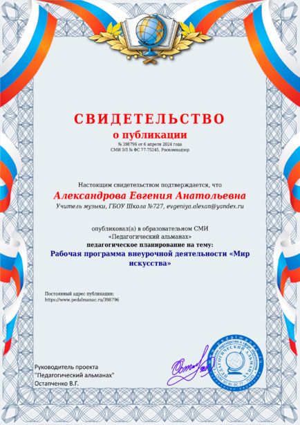 Александрова Евгения Анатольевна Рабочая программа внеурочной деятельности “Мир искусства” / Е. А. Александрова. – Текст : электронный // Педагогический альманах : электронное СМИ. - URL: https://www.pedalmanac.ru/398796. - Дата публикации: 6 апреля 2024.