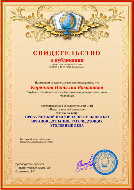 Корепина, Н. Р. ПРОКУРОРСКИЙ НАДЗОР ЗА ДЕЯТЕЛЬНОСТЬЮ ОРГАНОВ ДОЗНАНИЯ, РАССЛЕДУЮЩИХ УГОЛОВНЫЕ ДЕЛА [Электронный ресурс] / Наталья Романовна Корепина // Педагогический альманах : [сайт]. - 2024. - 26 апреля. - [Россия]. - Режим доступа: https://www.pedalmanac.ru/400274, свободный. - Загл. с экрана.