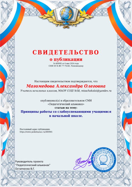Магомедова Александра Олеговна Принципы работы со слабоуспевающими учащимися в начальной школе. / А. О. Магомедова. – Текст : электронный // Педагогический альманах : электронное СМИ. - URL: https://www.pedalmanac.ru/400905. - Дата публикации: 6 мая 2024.