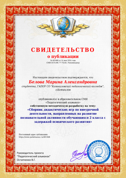 Белова Марина Александровна “Сборник дидактических игр по внеурочной деятельности, направленных на развитие познавательной активности обучающихся 2 класса с задержкой психического развития” / М. А. Белова. – Текст : электронный // Педагогический альманах : электронное СМИ. - URL: https://www.pedalmanac.ru/401468. - Дата публикации: 14 мая 2024.