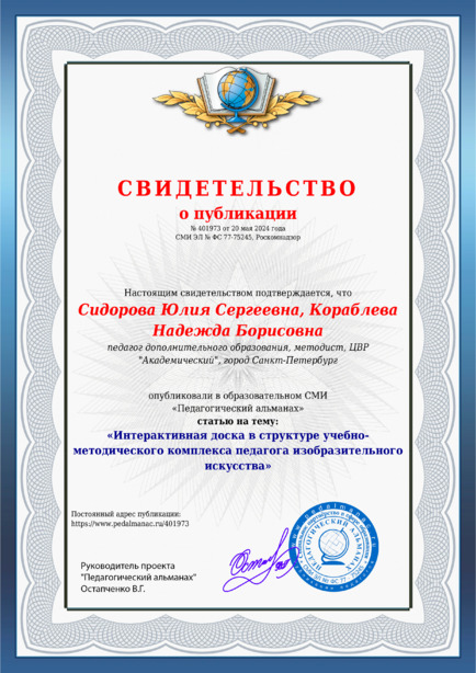 Сидорова Юлия Сергеевна, Кораблева Надежда Борисовна “Интерактивная доска в структуре учебно-методического комплекса педагога изобразительного искусства” / Ю. С. Сидорова. – Текст : электронный // Педагогический альманах : электронное СМИ. - URL: https://www.pedalmanac.ru/401973. - Дата публикации: 20 мая 2024.