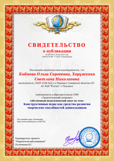 Бибнева Ольга Сергеевна, Хоруженко Светлана Николаевна Конструктивные игры как средство развития творческих способностей дошкольников / О. С. Бибнева. – Текст : электронный // Педагогический альманах : электронное СМИ. - URL: https://www.pedalmanac.ru/402704. - Дата публикации: 28 мая 2024.