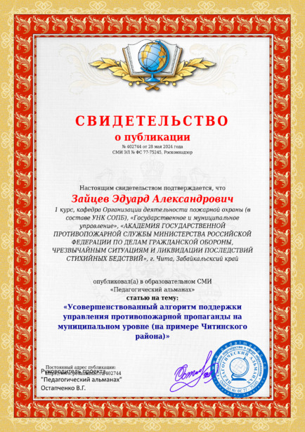 Зайцев Эдуард Александрович «Усовершенствованный алгоритм поддержки управления противопожарной пропаганды на муниципальном уровне (на примере Читинского района)» / Э. А. Зайцев. – Текст : электронный // Педагогический альманах : электронное СМИ. - URL: https://www.pedalmanac.ru/402744. - Дата публикации: 28 мая 2024.