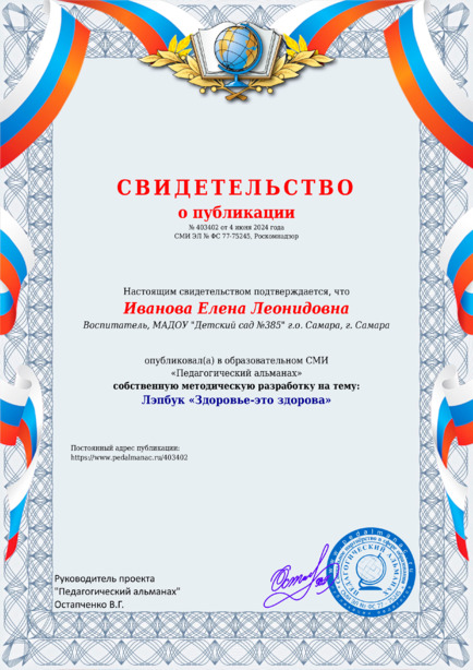 Иванова Елена Леонидовна Лэпбук “Здоровье-это здорова” / Е. Л. Иванова. – Текст : электронный // Педагогический альманах : электронное СМИ. - URL: https://www.pedalmanac.ru/403402. - Дата публикации: 4 июня 2024.