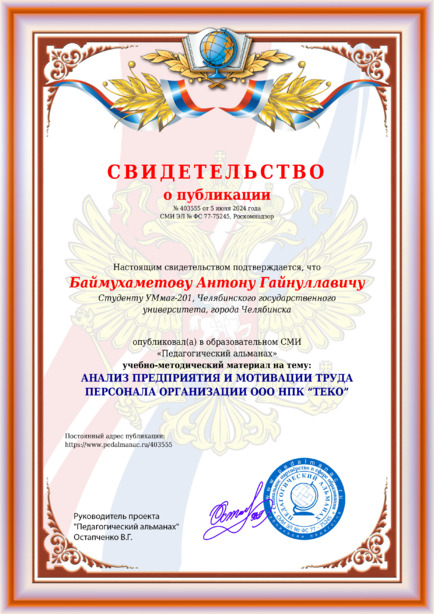 Баймухаметову Антону Гайнуллавичу АНАЛИЗ ПРЕДПРИЯТИЯ И МОТИВАЦИИ ТРУДА ПЕРСОНАЛА ОРГАНИЗАЦИИ ООО НПК “ТЕКО” / А. Г. Баймухаметову. – Текст : электронный // Педагогический альманах : электронное СМИ. - URL: https://www.pedalmanac.ru/403555. - Дата публикации: 5 июня 2024.