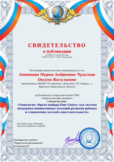 Антонова Мария Андреевна Чухалева Оксана Васильевна «Технология «Время выбора/Time Сhoice» как система поддержки инициативных ситуаций развития ребенка и становления детской самостоятельности» / М. А. Антонова. – Текст : электронный // Педагогический альманах : электронное СМИ. - URL: https://www.pedalmanac.ru/403566. - Дата публикации: 5 июня 2024.