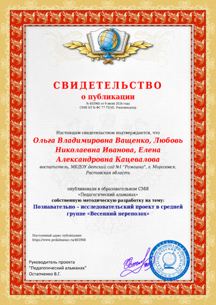 Ольга Владимировна Ващенко, Любовь Николаевна Иванова, Елена Александровна Кацевалова Познавательно – исследовательский проект в средней группе “Весенний переполох” / В. В. Ольга. – Текст : электронный // Педагогический альманах : электронное СМИ. - URL: https://www.pedalmanac.ru/403968. - Дата публикации: 9 июня 2024.