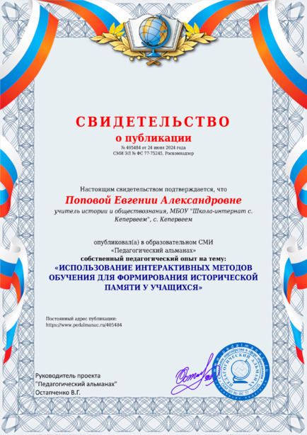 Поповой Евгении Александровне «ИСПОЛЬЗОВАНИЕ ИНТЕРАКТИВНЫХ МЕТОДОВ ОБУЧЕНИЯ ДЛЯ ФОРМИРОВАНИЯ ИСТОРИЧЕСКОЙ ПАМЯТИ У УЧАЩИХСЯ» / Е. А. Поповой. – Текст : электронный // Педагогический альманах : электронное СМИ. - URL: https://www.pedalmanac.ru/405484. - Дата публикации: 24 июня 2024.