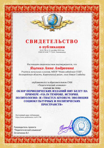 Яценко Анна Андреевна ОБЗОР ПЕРИОДИЧЕСКИХ ИЗДАНИЙ НИУ БЕЛГУ НА ПРИМЕРЕ «VIA IN TEMPORE. ИСТОРИЯ. ПОЛИТОЛОГИЯ» И «TRACTUS AEVORUM: ЭВОЛЮЦИЯ СОЦИОКУЛЬТУРНЫХ И ПОЛИТИЧЕСКИХ ПРОСТРАНСТВ» / А. А. Яценко. – Текст : электронный // Педагогический альманах : электронное СМИ. - URL: https://www.pedalmanac.ru/411706. - Дата публикации: 12 сентября 2024.