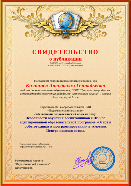 Кольцова, А. Г. Особенности обучения воспитанников с ОВЗ по адаптированной образовательной программе “Основы робототехники и программирования” в условиях Центра помощи детям. [Электронный ресурс] / Анастасия Геннадьевна Кольцова // Педагогический альманах : [сайт]. - 2024. - 13 сентября. - [Россия]. - Режим доступа: https://www.pedalmanac.ru/411873, свободный. - Загл. с экрана.