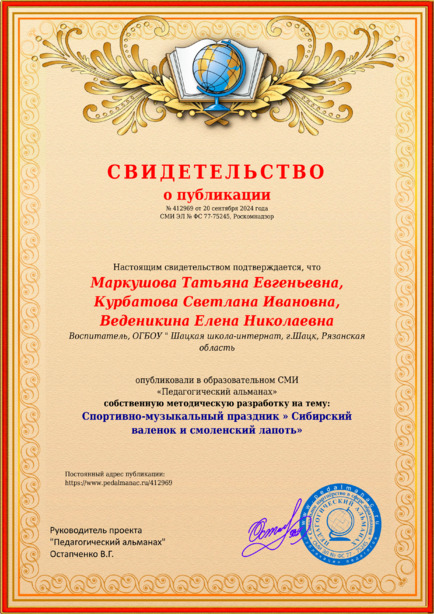 Маркушова Татьяна Евгеньевна, Курбатова Светлана Ивановна, Веденикина Елена Николаевна Спортивно-музыкальный праздник ” Сибирский валенок и смоленский лапоть” / Т. Е. Маркушова. – Текст : электронный // Педагогический альманах : электронное СМИ. - URL: https://www.pedalmanac.ru/412969. - Дата публикации: 20 сентября 2024.