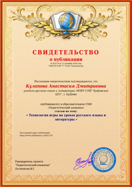 Кулапова Анастасия Дмитриевна ” Технология игры на уроках русского языка и литературы “ / А. Д. Кулапова. – Текст : электронный // Педагогический альманах : электронное СМИ. - URL: https://www.pedalmanac.ru/413114. - Дата публикации: 21 сентября 2024.
