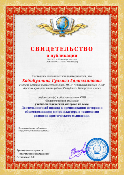 Хабибуллина, Г. Г. Деятельностный подход в преподавании истории и обществознания; метод кластера в технологии развития критического мышления. [Электронный ресурс] / Гульназ Галимзяновна Хабибуллина // Педагогический альманах : [сайт]. - 2024. - 23 сентября. - [Россия]. - Режим доступа: https://www.pedalmanac.ru/413432, свободный. - Загл. с экрана.