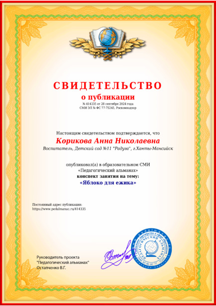 Корикова Анна Николаевна “Яблоко для ежика” / А. Н. Корикова. – Текст : электронный // Педагогический альманах : электронное СМИ. - URL: https://www.pedalmanac.ru/414335. - Дата публикации: 28 сентября 2024.
