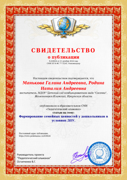 Манькова Галина Андреевна, Родина Наталия Андреевна Формирование семейных ценностей у дошкольников в условиях ДОУ. / Г. А. Манькова. – Текст : электронный // Педагогический альманах : электронное СМИ. - URL: https://www.pedalmanac.ru/418624. - Дата публикации: 21 октября 2024.