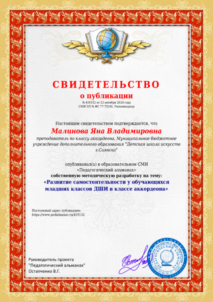 Малинова Яна Владимировна «Развитие самостоятельности у обучающихся младших классов ДШИ в классе аккордеона» / Я. В. Малинова. – Текст : электронный // Педагогический альманах : электронное СМИ. - URL: https://www.pedalmanac.ru/419152. - Дата публикации: 23 октября 2024.
