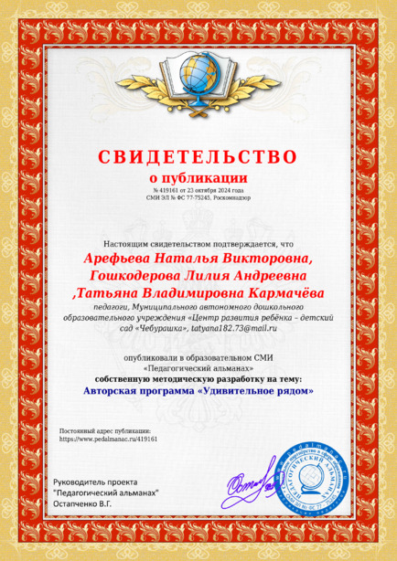 Арефьева Наталья Викторовна, Гошкодерова Лилия Андреевна ,Татьяна Владимировна Кармачёва Авторская программа “Удивительное рядом” / Н. В. Арефьева. – Текст : электронный // Педагогический альманах : электронное СМИ. - URL: https://www.pedalmanac.ru/419161. - Дата публикации: 23 октября 2024.