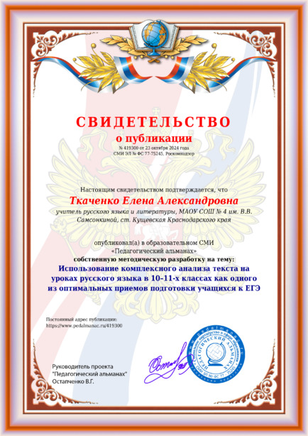 Ткаченко, Е. А. Использование комплексного анализа текста на уроках русского языка в 10–11-х классах как одного из оптимальных приемов подготовки учащихся к ЕГЭ [Электронный ресурс] / Елена Александровна Ткаченко // Педагогический альманах : [сайт]. - 2024. - 23 октября. - [Россия]. - Режим доступа: https://www.pedalmanac.ru/419300, свободный. - Загл. с экрана.