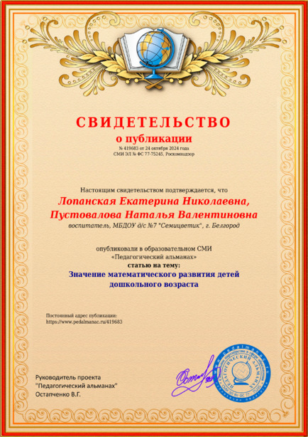 Лопанская Екатерина Николаевна, Пустовалова Наталья Валентиновна Значение математического развития детей дошкольного возраста / Е. Н. Лопанская. – Текст : электронный // Педагогический альманах : электронное СМИ. - URL: https://www.pedalmanac.ru/419683. - Дата публикации: 24 октября 2024.
