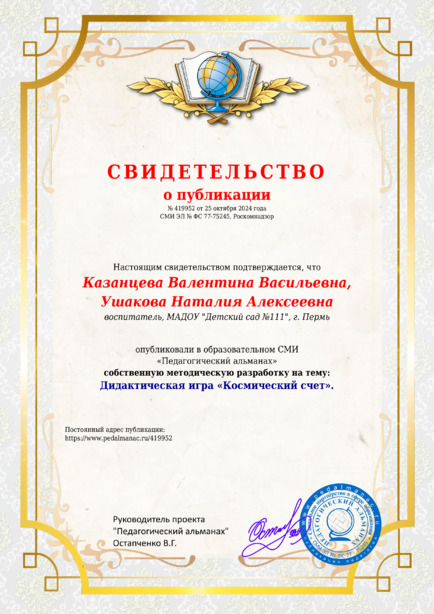 Казанцева, В. В. Дидактическая игра “Космический счет”. [Электронный ресурс] / Валентина Васильевна, Казанцева // Педагогический альманах : [сайт]. - 2024. - 25 октября. - [Россия]. - Режим доступа: https://www.pedalmanac.ru/419952, свободный. - Загл. с экрана.